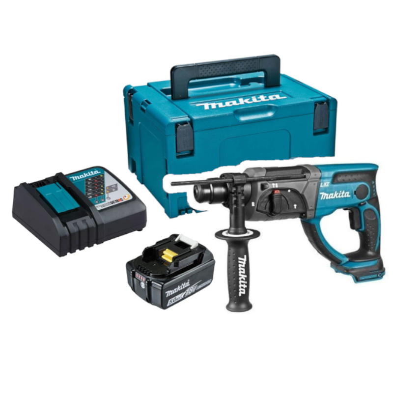 W zestawie: Młotowiertarka SDS, Uchwyt boczny, ogranicznik głębokości, 1 x akumulator 18 V 5,0 Ah, ładowarka. skrzynka.